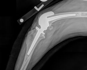 At Fitzbionics, we developed a rotating hinge total knee replacement which restores knee function even when all of the ligaments are damaged. 3D-printed guides allow the removal of the bottom of the femur and the top of the tibia. The marrow cavities were filled with cement which immediately fixed stems of both femoral and tibial implants, into which bone grew over time. A unique hinge mechanism mounted on an axle and a spigot allowed both of his knees to flex, extend and rotate, whilst avoiding dislocation.