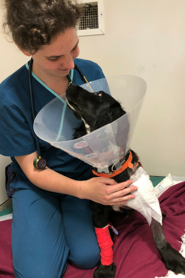 Sweep recovering in the wards with Veterinary Nurse Katie following fracture repair surgery at Fitzpatrick Referrals Orthopaedics and Neurology practice.